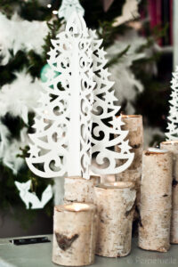 Disposez de jolis sapins délicatement découpés. Plantez les ensuite dans une branche de bouleau pour un effet champêtre.