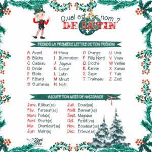 A la fois jeu et objet de décoration, l’affiche quel est ton nom de lutin va plaire aux petits et aux grands. Le principe est facile : chacun retrouve son prénom à partir de son initiale et son nom avec son mois de naissance. Fous rire garantis !