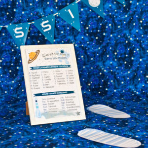 A la fois objet déco et jeux pour un anniversaire Espace, l’affiche trouvera parfaitement sa place près de la table de fête. Son principe est simple : chaque enfant retrouve son nom dans les étoiles à partir de l’initiale de son prénom et son mois de naissance. Je suis sûre que même les parents se prêteront au jeu !