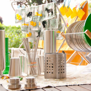 Les éléments de vaisselle loués sont totalement lavables. L’inox permet de garantir une hygiène irréprochable de votre table de fête. La vaisselle comprend : des pailles, cuillères, verres, assiettes et également un support à gâteau et des pots à eau.
