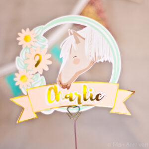 Vous ne voulez pas vous lancer dans un gâteau avec décor ? Il vous suffit juste de planter ce cake topper Poney Club. Et hop, voilà votre gâteau dans le thème ! La personnalisation de l’âge et du prénom le rend en plus unique. On a pas trouvé plus facile !