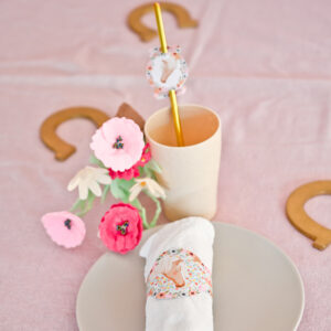 Pour créer une ambiance club d’équitation, nous vous proposons une déco d’anniversaire champêtre mêlant à la fois des matières naturelles comme le lin ou le kraft, avec des imprimés Liberty dans les tons roses et verts. Douceur et fleurs sont les maître mots de notre déco au Poney Club !
