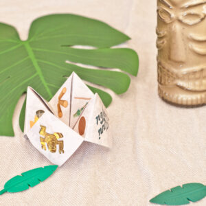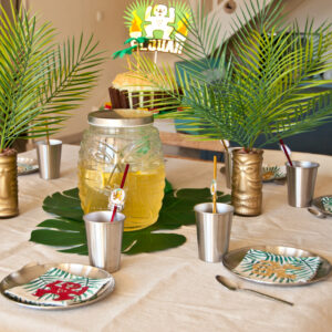 Lorsque vous choisissez d’organiser un anniversaire Koh-Lanta, il faut mettre le paquet sur la déco. Nous avons choisi une déco avec des couleurs naturelles agrémentées d’éléments exotiques : feuilles de cocotier, bols en noix de coco, fanions assortis, totems TIKI. Si vous avez la chance d’habiter Annecy, toute la déco de l’anniversaire Koh-Lanta est en location pour une fête zéro déchet ! Pour les autres, nous avons prévu des décos en papier : tour de verre, décos de paille, guirlandes de fanion, affiche totem et les lanternes Tiki réalisés par vos aventuriers.