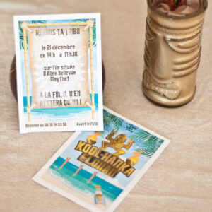 Pour l’invitation d’anniversaire Koh-Lanta, optez pour un design rappelant les éléments forts de l’émission. Vous avez ainsi au choix : les poteaux, la bouteille qui annonce l’épreuve, et même la bannière de chaque équipe. Ajoutez un totem, des feuilles de cocotier, et vos invités sauront directement où ils mettent les pieds !