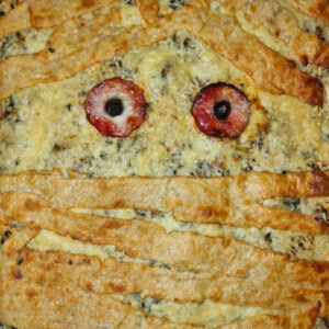 En mettant la pizza au menu, vous aurez toutes les chances de plaire à vos convives. Le petit détail zombies ? Superposez des languettes de pâte feuilletée pour un effet Momie !